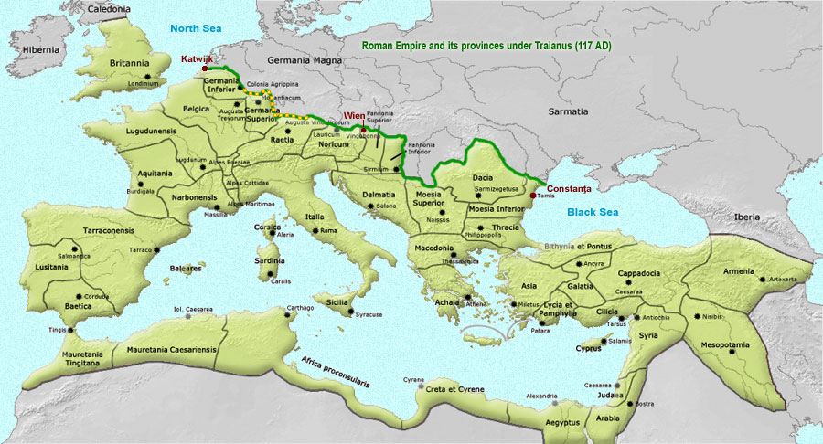 Limes cycle route: 4100 km from North Sea to Black Sea For the years 2008 and 2009 Henro de Witt and I have chosen for cycling along the border of the Roman Empire from Katwijk aan Zee to Constanta (see map above). We have covered the first half, from Katwijk to Wien, in July 2008. The second part, from Wien to Constanta followed in April/May 2009. Detailed descriptions with maps and photos are given on the next pages (click bike-button top right). For easy reference, the Limes route is described from west to east, although we have cycled the first part of the route in opposite direction (see bike transport). Tour in a nutshell Katwijk