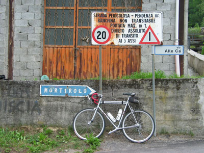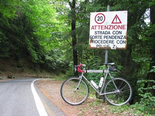 Introduction. Never before I have had the experience that a 10% climb can be a relief. That is probably the best way to characterize the Passo di Mortirolo, a bastard that you will appreciate when you have reached the summit. The Mortirolo demonstrates that the highest passes are not always the toughest. There are climbs that have stretches with a steeper gradient, but there are to my knowledge no other climbs that continue to climb well over 10% for so many kilometers. In that respect the Mortirolo seems unsurpassed by any other climb. The first 3 kilometers are relatively easy, after that the serious part comes: six kilometers 11 to 14%, with short stretches up to 18%. No way to relax. Finally the gradient drops to 10-7%. At the top there is satisfaction and, when we climbed the Mortirolo, rain. The Mortirolo does not offer stunning mountain views. Nearly the full length of the climb winds through a dense forest, which makes it easy to focus your attention to next hundreds of meters in front of you (and they usually need your full attention). With respect to the Mortirolo