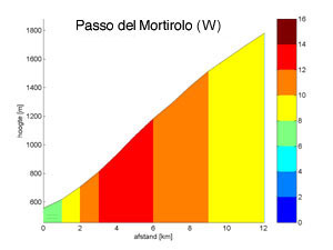Navigation: Start page | Albula Pass | Passo di Foscagno et al. | Passo di Gavia | Passo dello Stelvio | Pass Umbrail Profile and more images. The gradient profile of the Passo di Mortirolo - from Mazzo di Valtellina - has been made by Ward Oud in Matlab, based on the read out of his Ciclomaster HAC 4 cycle computer. Click here to download a more detailed version in pfd format (12 k). |