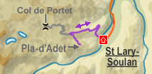 The climb to Pla d'Adet is graded 'Hors Categorie' in the Tour de France ranking system, which makes sense. A difference in altitude of 850 meters between Vignec and the ski resort has to be conquered in hardly more than 10 kilometers. The day before Ward has climbed the bastard the Red Bull Road Rage downhill cycling event was organized. Frédéric Moncassin, the winner, and other daredevils cycled 4.3 km of Pla d'Adet with speeds up to 95 km/h. At roughly two-third of the climb, shortly after passing Espiaube, there is a possibility to turn right for the Col de Portet (2215 m). The name 'col' is somewhat misleading. The road finishes at a car park surrounded by ski lifts and related buildings. You have to descend along same road as used uphill. There seems to be no facilities in summer. See CyclingCols for a gradient profile. |