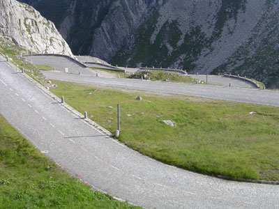 in Switzerland.  After the Umbrail pass (see our 2004 cycling tour) the Nufenenpass is the highest pass in Switzerland. It is also one of the youngest; road construction was completed in 1964. The west slope (ascent from Ulrichen) is fairly steep, on average 8%, while the last 9 km are continuously 9% or more. The downhill section initially drops quickly (8-11%), but after the village of All'Aqua a more gently graded slope towards Airolo follows. It is a really nice pass that fully deserves the classification HC (hors catégorie = the most challenging passes). In Airolo there are four possibilities